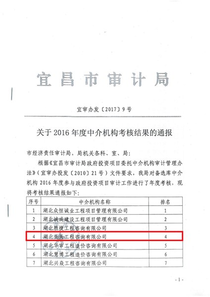 宜昌市审计局2016年度优秀审计机构表彰